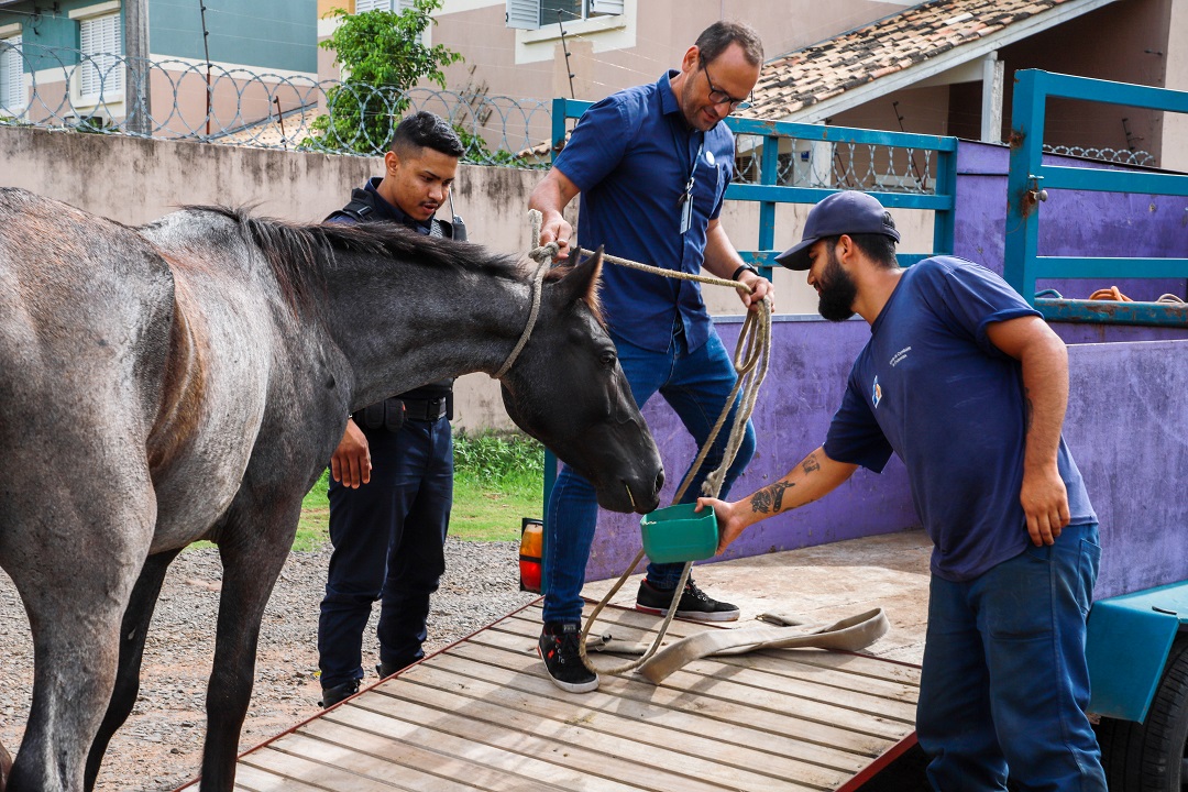 “Imediatamente, reunimos nossa equipe e nos deslocamos para o local, onde verificamos que o cavalo estava sem comida, sem água e sem abrigo. O animal foi recolhido e levado à sede da Secretaria Municipal de Serviços Urbanos (SMSU), onde passou a noite longe da chuva e com alimentação adequada”, explica o secretário interino da SMSU, Paulo Osório.