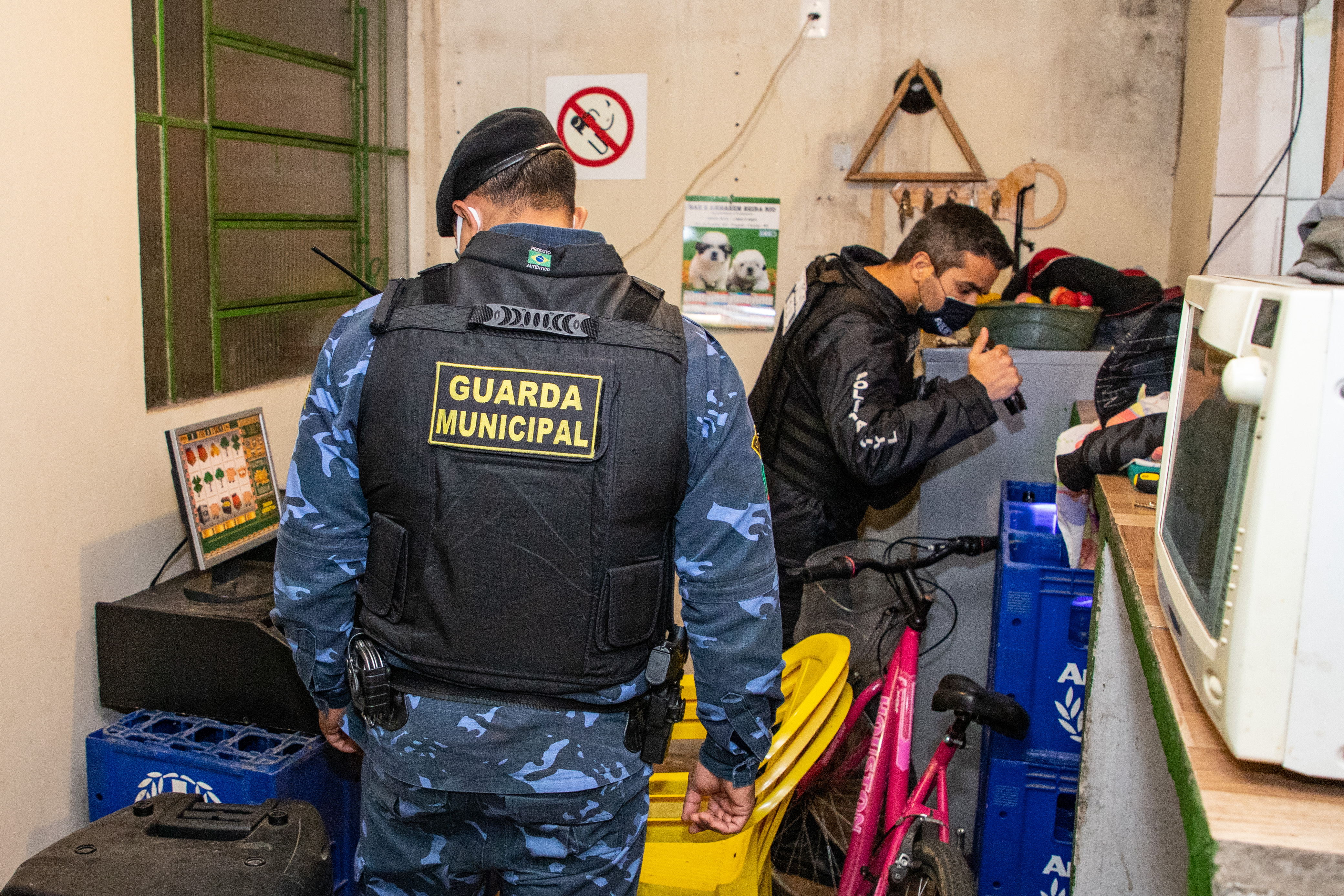 Durante as ações de fiscalização que ocorreram no bairro Rio Branco, dois bares foram interditados. Em ambos foi verificado que, além de estarem funcionando com atendimento no local, o que já é proibido pelas regras da bandeira atual, também estavam promovendo aglomerações. Em um deles também foram encontradas e apreendidas máquinas de jogos eletrônicos de azar.