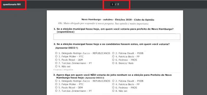 Outro fato curioso foi o nome do documento anexado no site do TSE: “Questionário Novo Hamburgo Zucco 2”. Rodrigo Lorenzoni Zucco, conhecido como “delegado Zucco”, é o candidato a prefeito do partido Republicanos no município do Vale dos Sinos. Em 26 de outubro, a empresa retirou do site do TSE o documento original, o substituindo por um arquivo denominado “Questionário NH”. Foi anexado, então, um documento contendo as cartelas empregadas no questionamento aos eleitores.