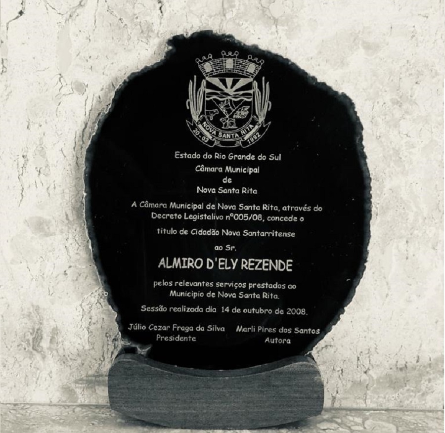 Almiro D’ely Rezende, ou Miro, como era conhecido, faleceu na última terça-feira, 15, aos 90 anos. Nascido no dia 9 de agosto de 1930, Miro percorreu uma caminhada marcante junto à comunidade de Nova Santa Rita, onde construiu uma família com sua esposa Maria de Lourdes, com quem teve três filhos, dois genros, cinco netos e duas bisnetas.
