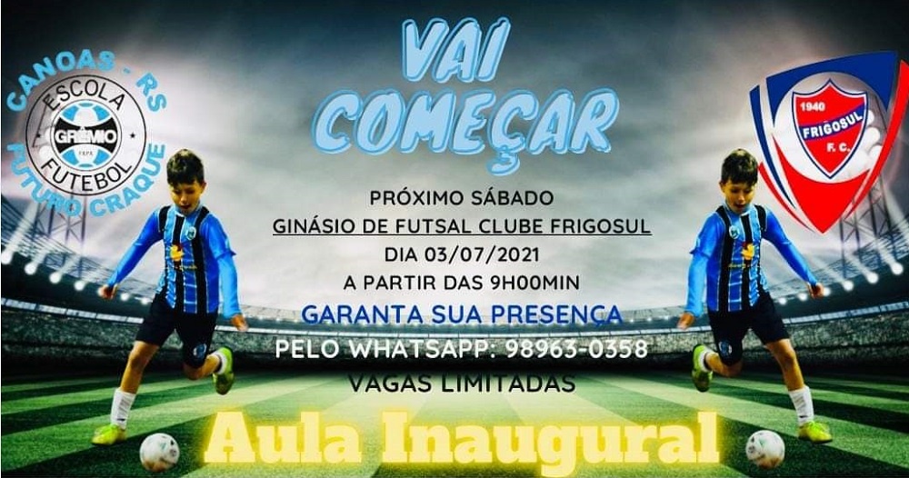 Atenção papai, mamãe, tio, padrinho e avô: leve seu pequeno para treinar na Escola de Futebol do Grêmio – futuro Craque. Sábado tem aula inaugural, venha conhecer!