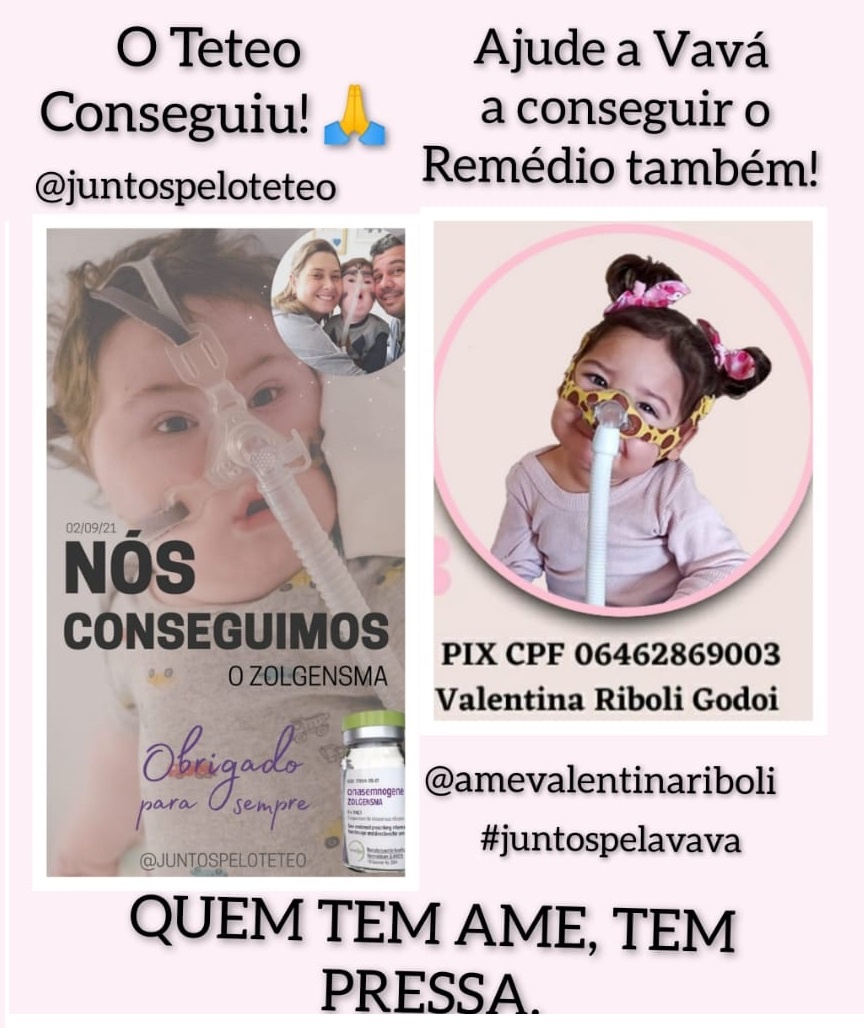 “Olá meu nome é Michel Gabriel Bonette Riboli, venho através dessa Vakinha pedir de todo meu coração a ajuda para a minha Sobrinha, ‘Valentina Riboli Godoi’, diagnosticada no dia 28/01/2021 com AME tipo 1. Os médicos disseram que o medicamento que contribui para melhora neste momento é o ‘Spinraza’, esse medicamento faz aumentar a produção de proteína no corpo e as crianças que respondem bem ao tratamento podem voltar a andar ou até correr. E após ela tomar esse medicamento Spinraza, ela estaria liberada para ir pra casa, mas em casa ela precisaria usar o respirador mecânico + a máscara de Oxigênio, isso tudo custaria em torno R$ 85.000,00, e com isso temos ainda todos os custos de medicamentos, hospitalares, fisioterapia, deslocamento, alimentação e tudo mais”.