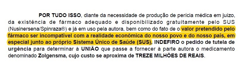 A família entrou na Justiça, através do TRF1, para que a União arcasse com o medicamento, mas o juiz do caso negou o pedido no último dia 25 de agosto. De acordo com divulgação dos organizadores da campanha, “magistrado indeferiu alegando que o ajuizamento da ação para Zolgensma passou a ser estratégia de mercado”.