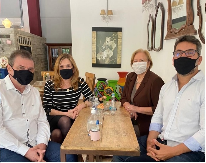 Registro do encontro da líder da bancada progressista na Câmara de Porto Alegre e Canoas, Monica Leal e Patrício com a senadora Ana Amélia Lemos e o presidente Municipal Marcos Daniel.