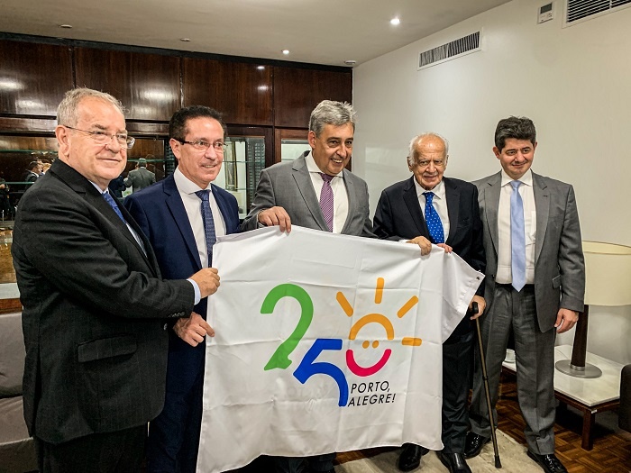 Em comemoração aos 250 anos de Porto Alegre, o vereador Airton Souza (MDB) representou Canoas na sessão Plenária do Grande Expediente da Assembleia Legislativa, na terça-feira, 22. Ao lado dele está o prefeito de Porto Alegre, Sebastião Melo (C), Pedro Simon e Tiago Simon, e demais autoridades do Estado.