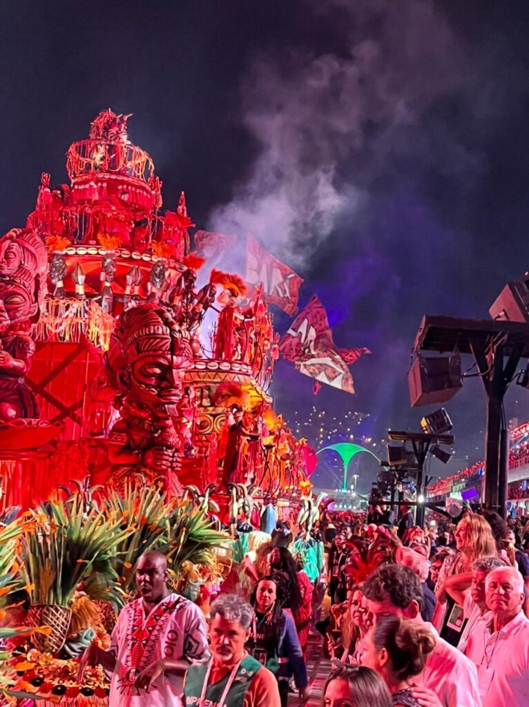 Exú – Antes da apuração, o historiador Douglas Souza Angeli já fazia o seguinte comentário nas redes sociais: “O que os carnavalescos Gabriel Hadad e Leonardo Bora e os sambistas e componentes da Grande Rio fizeram foi um fenômeno de cores, luzes, sons e movimentos. Cada componente fazia parte das alegorias como esculturas que ganhassem vida, cada dança fazia parte das cores, cada gesto parte dos sons, cada parte encontrava sentido no todo. Ser campeã disparada na apuração de terça será um merecido detalhe”. Conforme Pierre Verger, no livro Orixás: Deuses iorubas na África e no Novo Mundo (1981), Exú é um orixá de múltiplos e contraditórios aspectos, sendo o guardião dos templos, das casas, das cidades e das pessoas, servindo de intermediário entre os homens e os deuses.