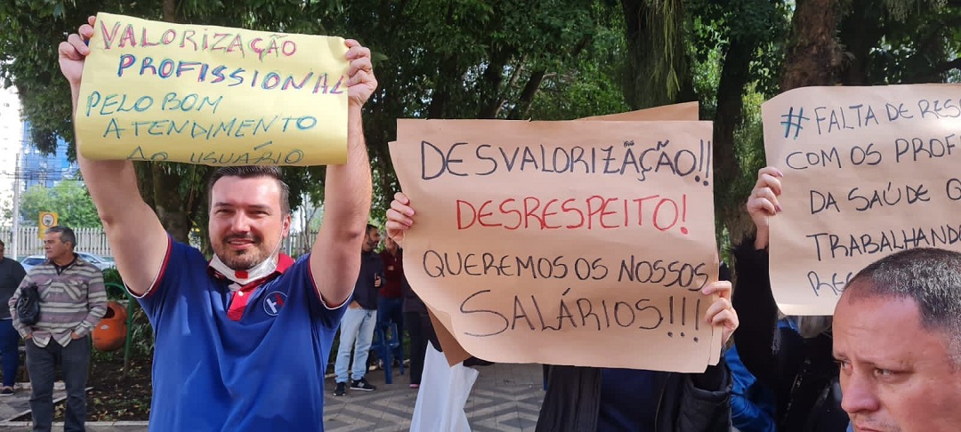 Ao meio dia desta quarta-feira, 10, cerca de 100 profissionais da área da saúde protestaram em frente à Prefeitura de Canoas para cobrar pagamentos atrasados.