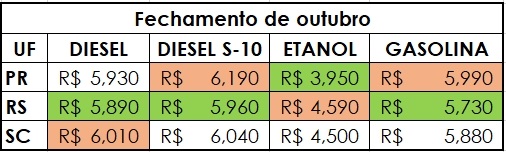 A última análise do Índice de Preços Edenred Ticket Log (IPTL), levantamento que consolida o comportamento de preços das transações nos postos de combustível, trazendo uma média precisa, apontou que no fechamento de outubro a gasolina foi comercializada a R$ 5,84 na Região Sul do País, após redução de 0,34% ante a primeira quinzena de outubro.