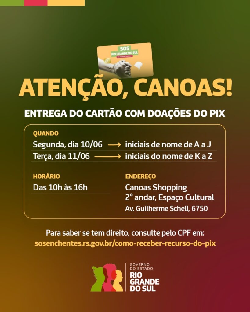 Os canoenses começam a receber o cartão e os valores do PIX SOS Rio Grande do Sul, do Governo do Estado, a partir da próxima semana.