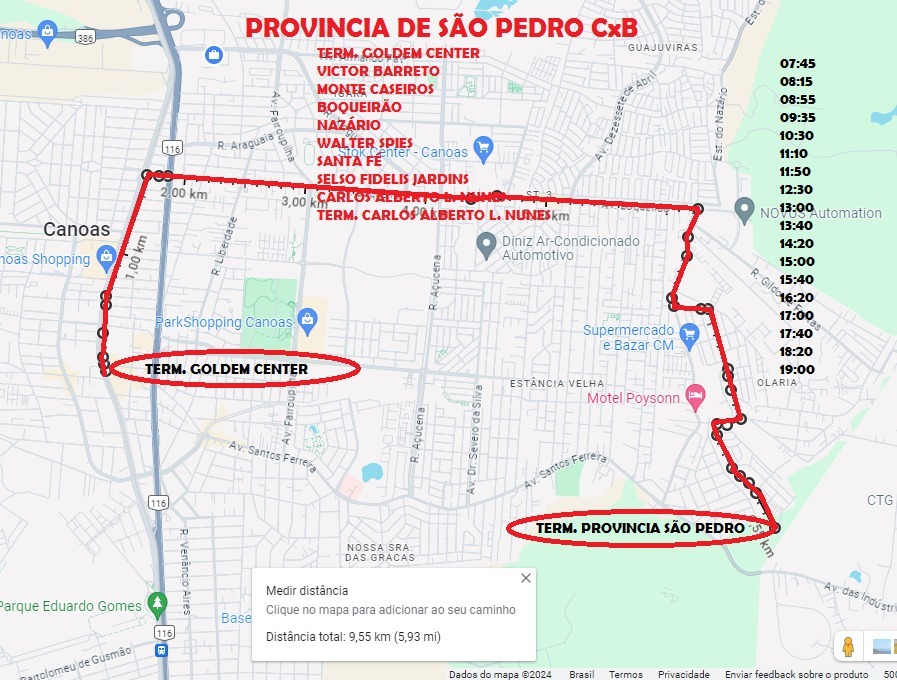 Sentido Bairro/Centro: saída do terminal Carlos Alberto L. Nunes, percorrendo ruas Selso Fidélis Jardins, Santa Fé, Walter Spies, Avenida do Nazário, Avenida Boqueirão, ruas Ceará, Mato Grosso, Av. Guilherme Schell, passagem de nível da Pedro Weingartner, Avenida Victor Barreto e encerra no Terminal Golden Center.