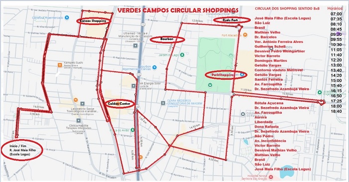 Circular Shoppings: as viagens partem do terminal da Rua José Maia Filho (Escola Logus), percorrendo as ruas São Luiz, Brasil, Mathias Velho, Dr. Barcelos e Vereador Antônio Ferreira Alves, Avenida Guilherme Schell, passando pelo desnível da Rua Pedro Weingartner, Avenida Victor Barreto, Rua Domingos Martins, Avenida Getúlio Vargas, contorno do viaduto Metrovel, avenidas Getúlio Vargas, Santos Ferreira, Farroupilha e Dr. Sezefredo Azambuja Vieira. O coletivo faz o retorno na Rótula Açucena, voltando pela Avenida Dr. Sezefredo Azambuja Vieira, Avenida Farroupilha, ruas Aurora, Liberdade, Dona Rafaela, Dr. Sezefredo Azambuja Vieira, Rua São Pedro, Avenida Inconfidência, Victor Barreto, cruzando o desnível Mathias Velho, ruas Mathias Velho, Brasil, São Luiz e chegando novamente na Rua José Maia Filho (Escola Logus).