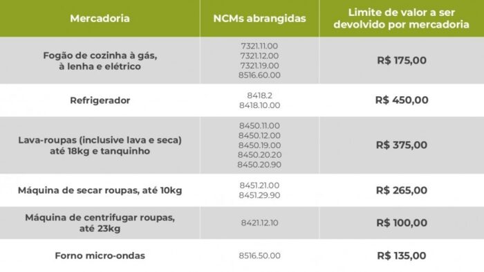Os eletrodomésticos incluídos no programa são fogão de cozinha (a gás, a lenha ou elétrico), refrigerador, lava-roupas (inclusive lava e seca) de até 18kg, máquina de secar roupas de até 10kg, máquina de centrifugar roupas de até 23kg e micro-ondas. A compra pode ser em loja on-line ou física, desde que o estabelecimento esteja localizado no Rio Grande do Sul – clique para conferir a lista de empresas participantes.