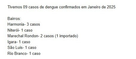 De acordo com informações da Secretaria de Saúde de Canoas, há nove casos de dengue registrados no mês de janeiro de 2025. No ano passado, logo nos primeiros dias, constatou-se surto da doença no bairro Estância Velha, com dez casos positivos, e até o final do mesmo período já registrava mais de 60.