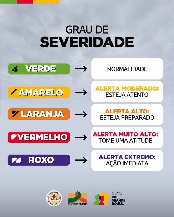 Atualmente, os alertas da Defesa Civil gaúcha seguem uma escala cromática associada à gravidade dos eventos hidrometeorológicos.